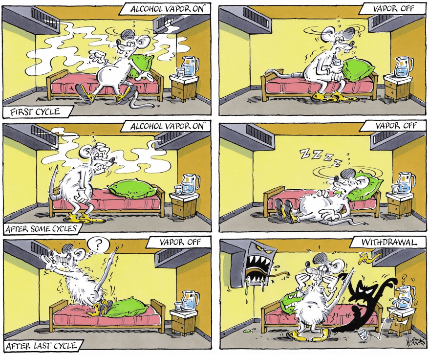 Another example, otherwise claimed to be minimally invasive and highly relevant for medication testing (Meinhardt and Sommer, 2015), is the post-dependent animal model, a model for medication development in alcoholism. It involves inducing dependence through repeated intermittent cycles of alcohol vapour exposure. In other words, rodents (usually, rats) are exposed every day, for several weeks or months, to cycles of intoxication with alcohol vapours, alternating with withdrawal, which ultimately result in compulsive alcohol intake, excessive alcohol seeking, hypersensitivity to stress as well as the development of an alcohol withdrawal syndrome, which better resemble human alcoholism.