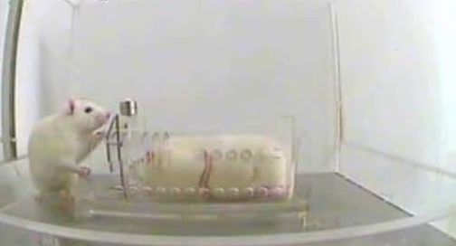 The presence of a rat trapped in a restrainer elicits focused activity from his cagemate, leading eventually to door-opening and consequent liberation of the trapped rat. (Science/AAAS).